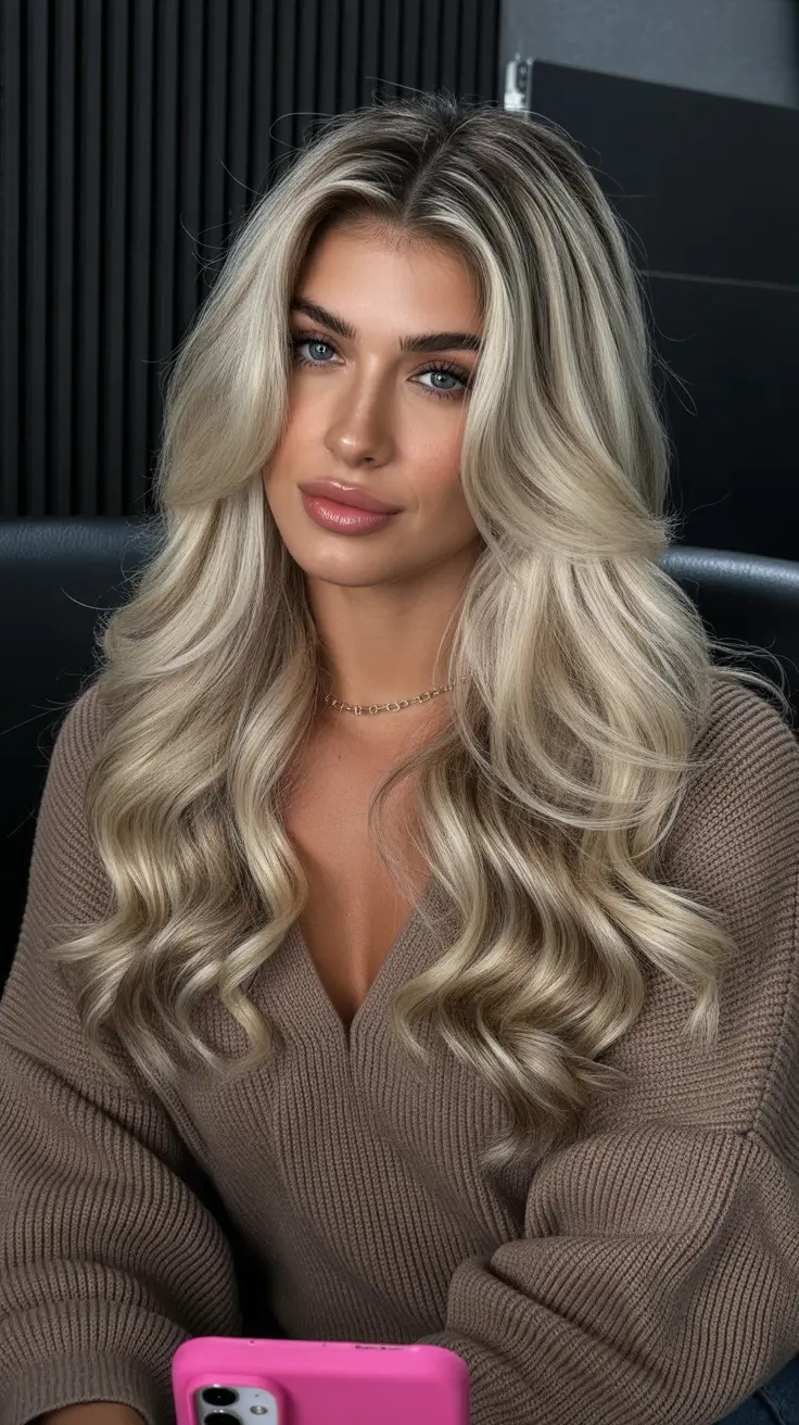 This is the eternal timeless blonde fashion – a wave of champagne colored hair that falls in undulating, voluminous waves. It is high-class but adorable, and can be worn during these warm winter parties when you feel like being stylish without trying too much. The position of balayage in this makes it have depth and dimension thus flattering those with green eyes and brown eyes.