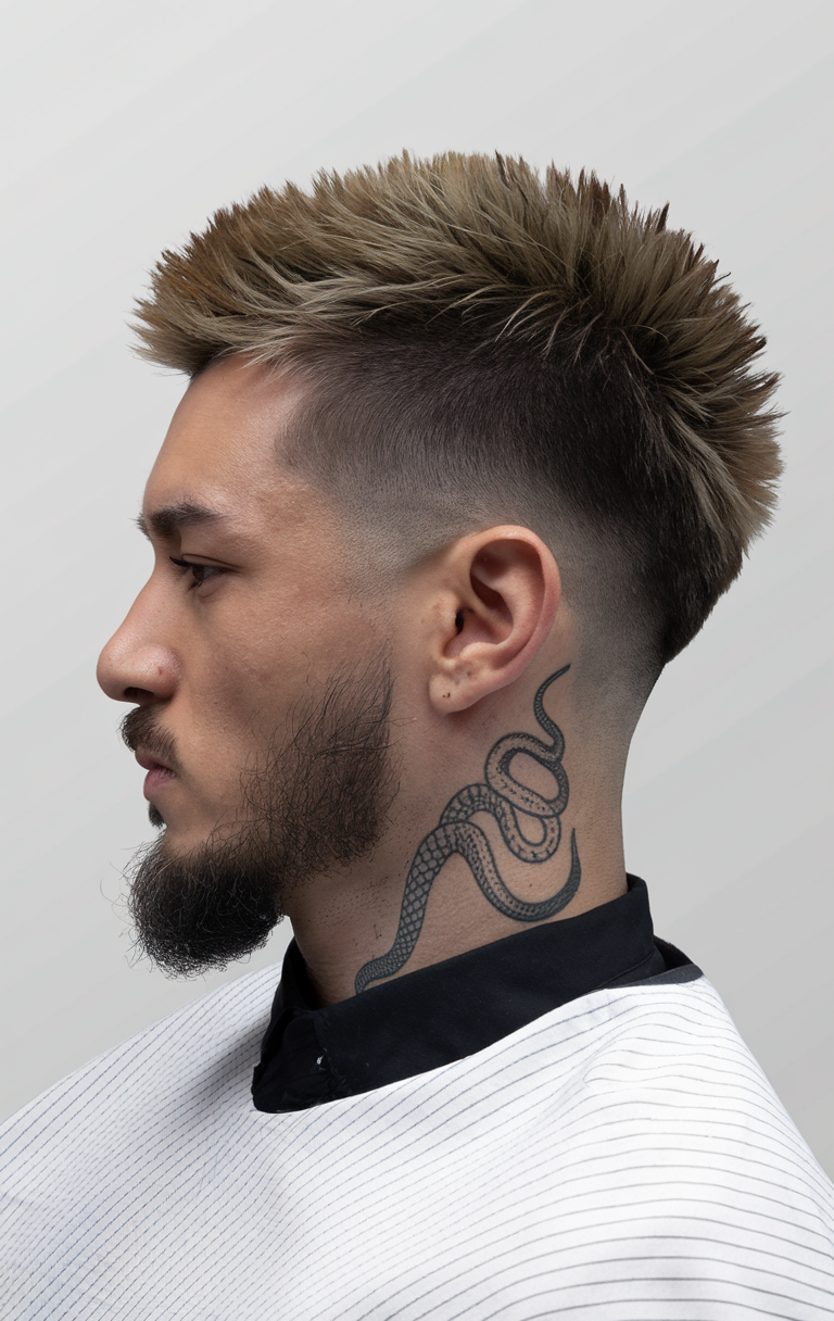 Spiky hair with a skin fade is a bold and dynamic style. The fade gives it a neat and polished appearance, while the spikes add an edgy touch. It’s a great look for those wanting a clean, modern, and stylish haircut that stands out.