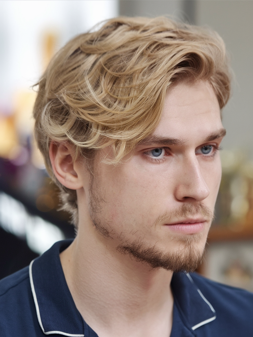 This wavy hair style features a tousled side part, ideal for those who want a more relaxed and natural appearance. The volume and flow of the waves create a stylish yet effortless look, perfect for casual settings. It’s a trendy choice for men with medium length hair who want to keep things attractive yet simple.