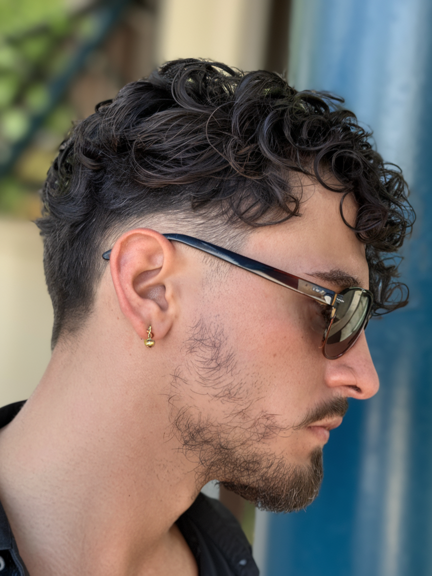 A perfect blend of curly hair and sharp fades, this style combines texture with precision. The fade keeps the sides neat, while the curly top adds volume and style. This cut works well for men looking for something trendy yet manageable, with just the right balance between clean lines and natural texture.