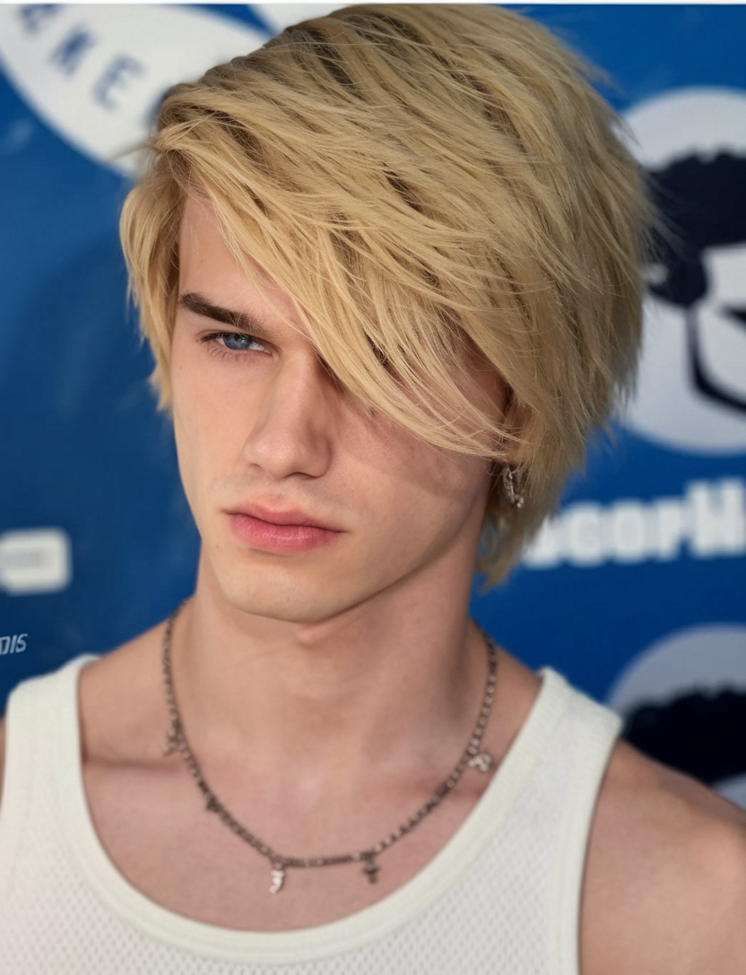 This medium length blonde fringe cut is ideal for those wanting to showcase their hair’s texture. The soft, swept fringe creates a dramatic effect while keeping the look casual. Best for men with straight hair who want a unique but simple style that doesn’t require much effort.