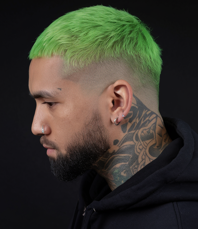 Bold and edgy, this neon green buzz cut is perfect for anyone looking to make a statement. The faded sides add a modern touch, while the vibrant color keeps it unique and eye-catching. This look works best for men who want to stand out and keep their hair short and clean.