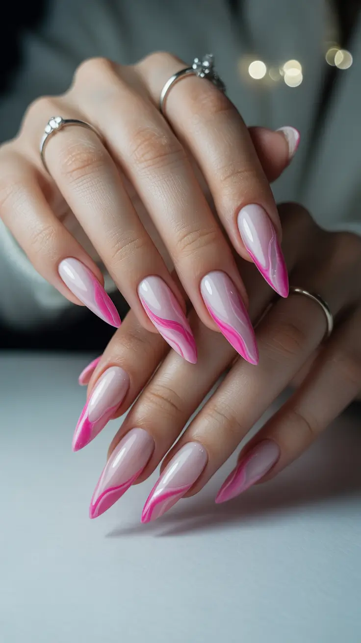 Let’s talk about that green. Neither forest, nor mint, but dark purple almost like a bouquet it had been cut out of in the fall. This is a thoroughly modern but equally structured and stylish appearance when combined with a modern French layout on almond-shaped acrylics. The swirl of the accent on one nail gives it some motion, and the combination of negative space and full coverage makes it interesting. It is providing art-school graduate who sips matcha and has the best playlists. Basically? Obsessed.