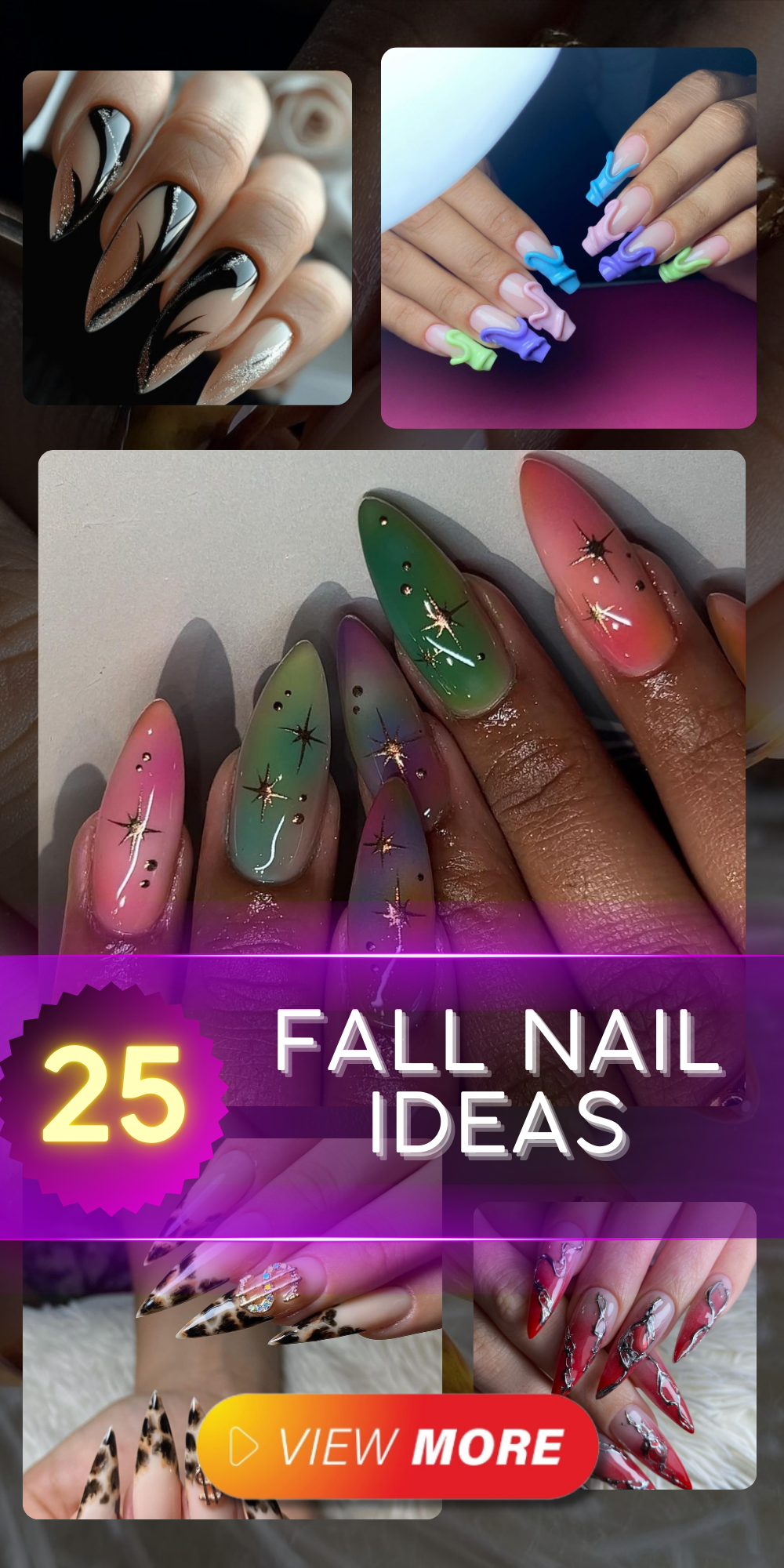 This dreamy design features a gradient of pastel colors with delicate star accents. The soft transitions between pink, green, and blue create a calming and ethereal look, while the star details add a touch of whimsy and magic, perfect for a cute fall manicure.