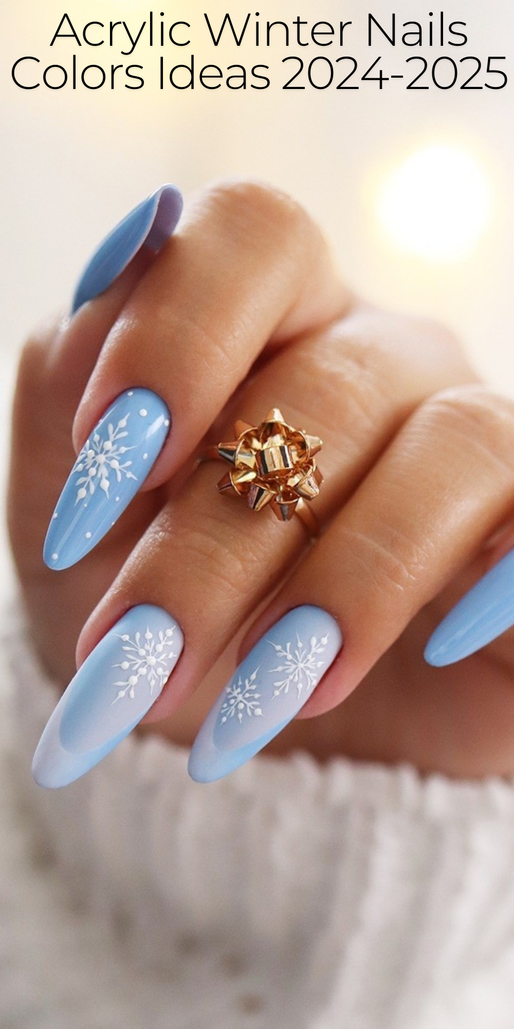 These long almond nails showcase a soft blue gradient with hand-painted white snowflakes, creating a classic winter feel. The icy tones and delicate snowflake accents add a touch of seasonal elegance. Perfect for those seeking colorful winter nails that capture the essence of a snowy day.