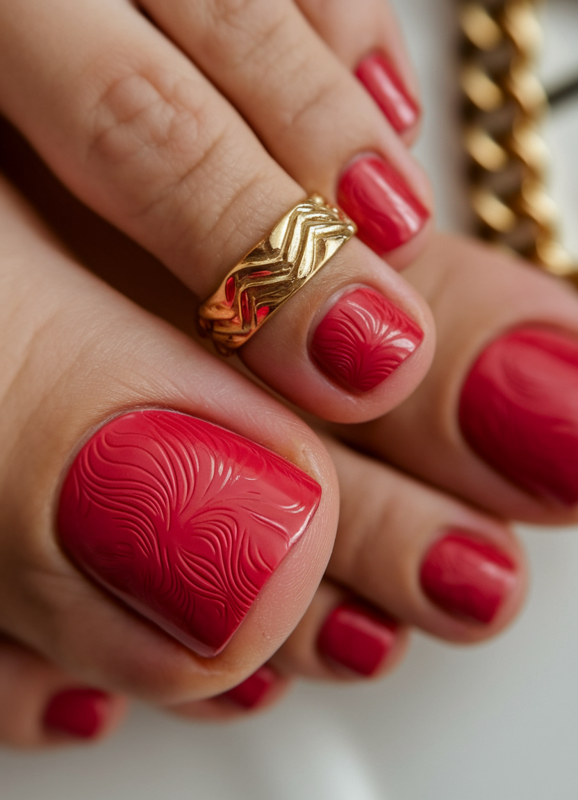 This red nail design features a unique embossed texture, adding depth and dimension to the look. The gel polish creates a rich and glossy finish, making the bold red colour stand out even more. This artistic touch is ideal for those who love eye-catching toe nail art with a creative twist. A stylish and modern choice for those who want to elevate their April toe nails ideas 2025.