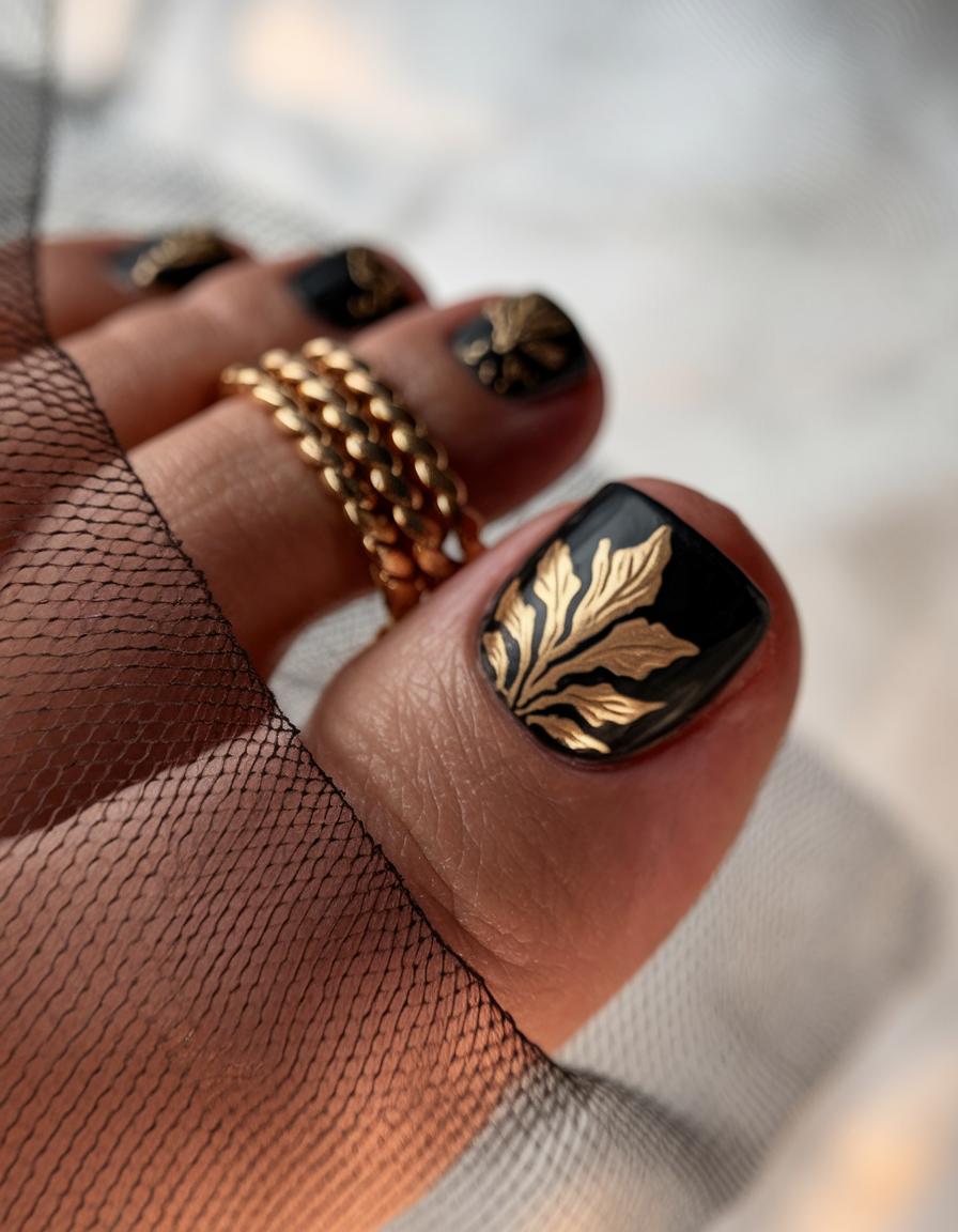 This black gel polish sets a bold foundation for intricate gold leaf art, creating a sophisticated and dramatic effect. The high-gloss finish enhances the contrast, making this design perfect for those who love luxurious details. The delicate gold accents add depth and movement, giving the toe nails a rich and elegant appearance. A stunning choice for formal events or those who appreciate chic, dark nail art.
