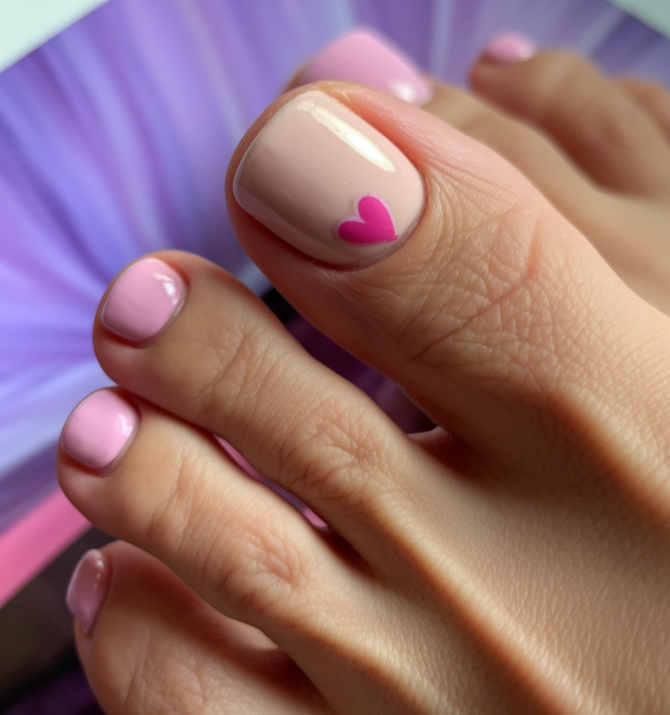 A delicate pink gel polish provides a soft and feminine look, ideal for a fresh and youthful style. A tiny pink heart art design on the big toe adds a subtle romantic touch without overpowering the simple nail look. The glossy gel finish enhances the smoothness and durability of the nails. This toe nail design is perfect for everyday wear while maintaining a playful and elegant charm.