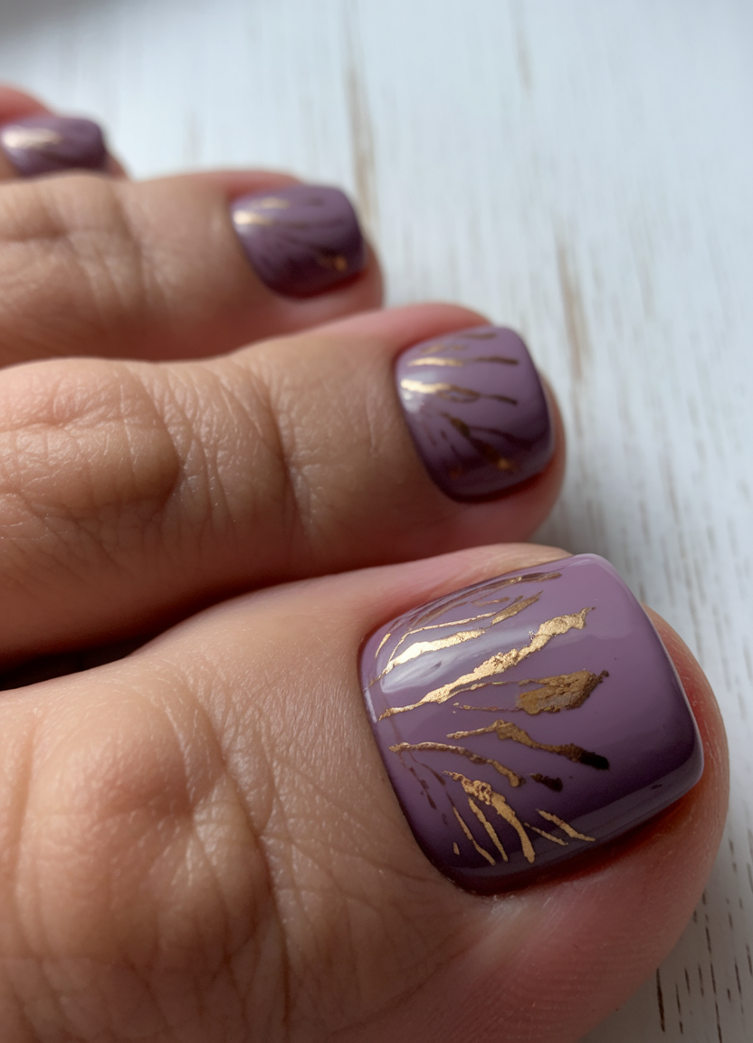A muted purple polish gives these toe nails a trendy and sophisticated look, complemented by artistic gold streaks. The abstract gold foil art creates a unique and modern aesthetic, making the design stand out while keeping it refined. The gel application ensures a smooth and long-lasting finish, perfect for those who want a stylish yet understated nail look. This design is a great choice for both casual and elegant occasions.