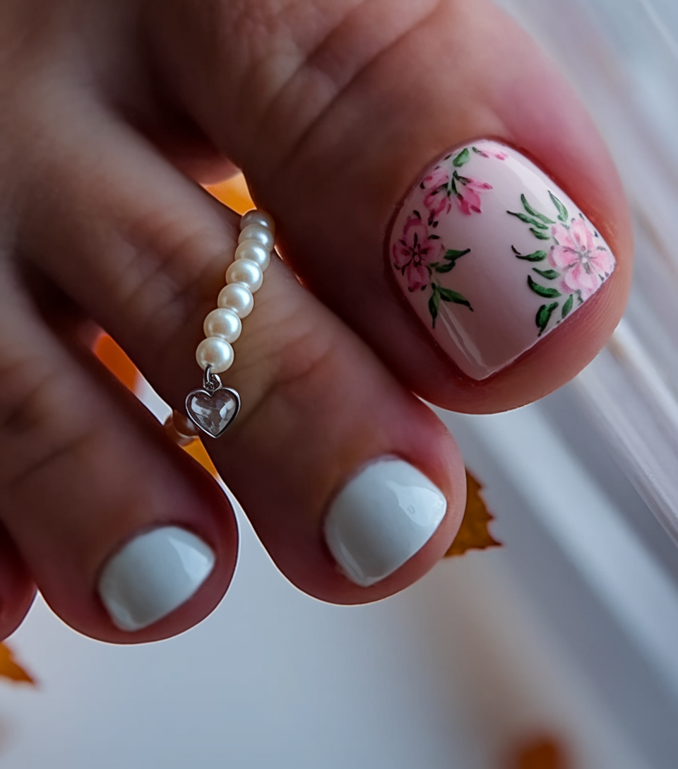 This toe nail design features a delicate pink gel polish with hand-painted floral art, adding a soft and feminine touch. The small green leaves complement the spring-inspired design, making it perfect for a fresh, natural look. The addition of white polish on the smaller nails enhances the clean and elegant aesthetic. A unique pearl embellishment along the toe line adds an extra element of sophistication, making this a standout 2025 nail trend.