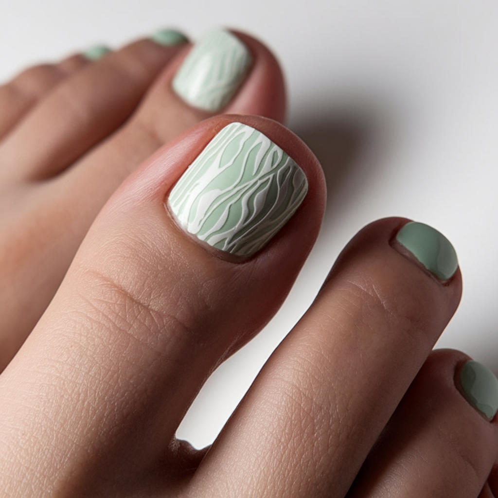 A fresh white polish serves as the backdrop for a green leaf design, bringing a nature-inspired touch to this pedicure. The bold black zigzag pattern on the smaller toe adds a striking contrast, balancing the softness of the green art. This spring-inspired design is perfect for those who love unique and creative toe nail styles. The combination of short nails and a gel polish finish ensures a modern, clean look.
