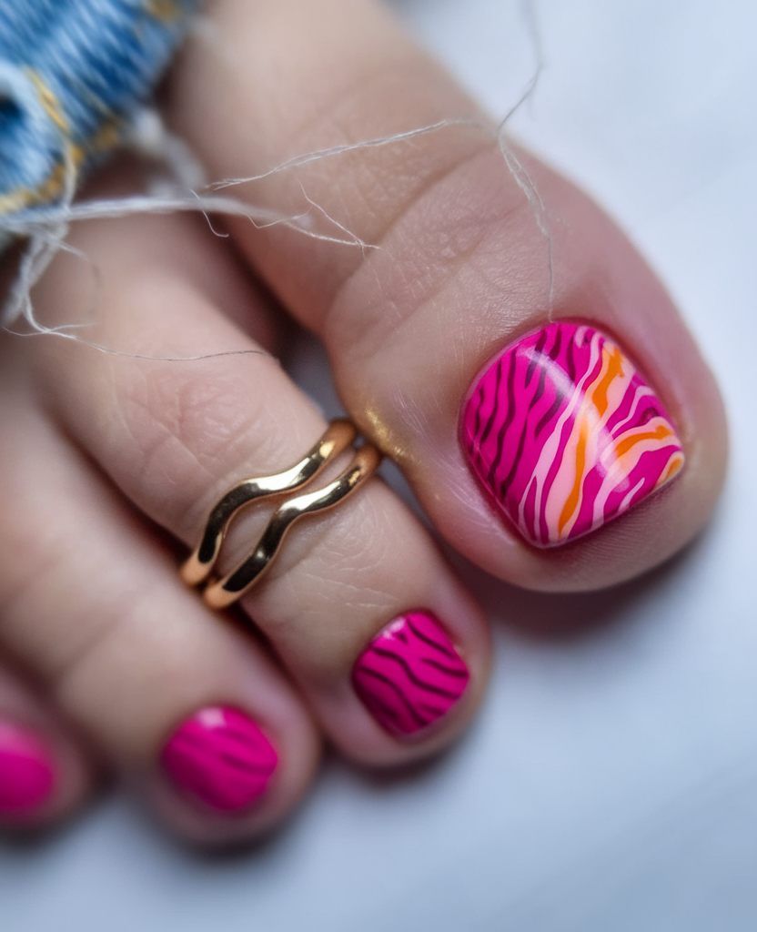 This bold pink gel polish makes a statement with a playful zebra pattern, featuring accents of orange and white for added contrast. The combination of animal print art and bright summer colours creates an energetic and eye-catching look. The short nail shape keeps the design practical while maintaining its fun and trendy appeal. Ideal for those who love vibrant and unique toe nail styles.