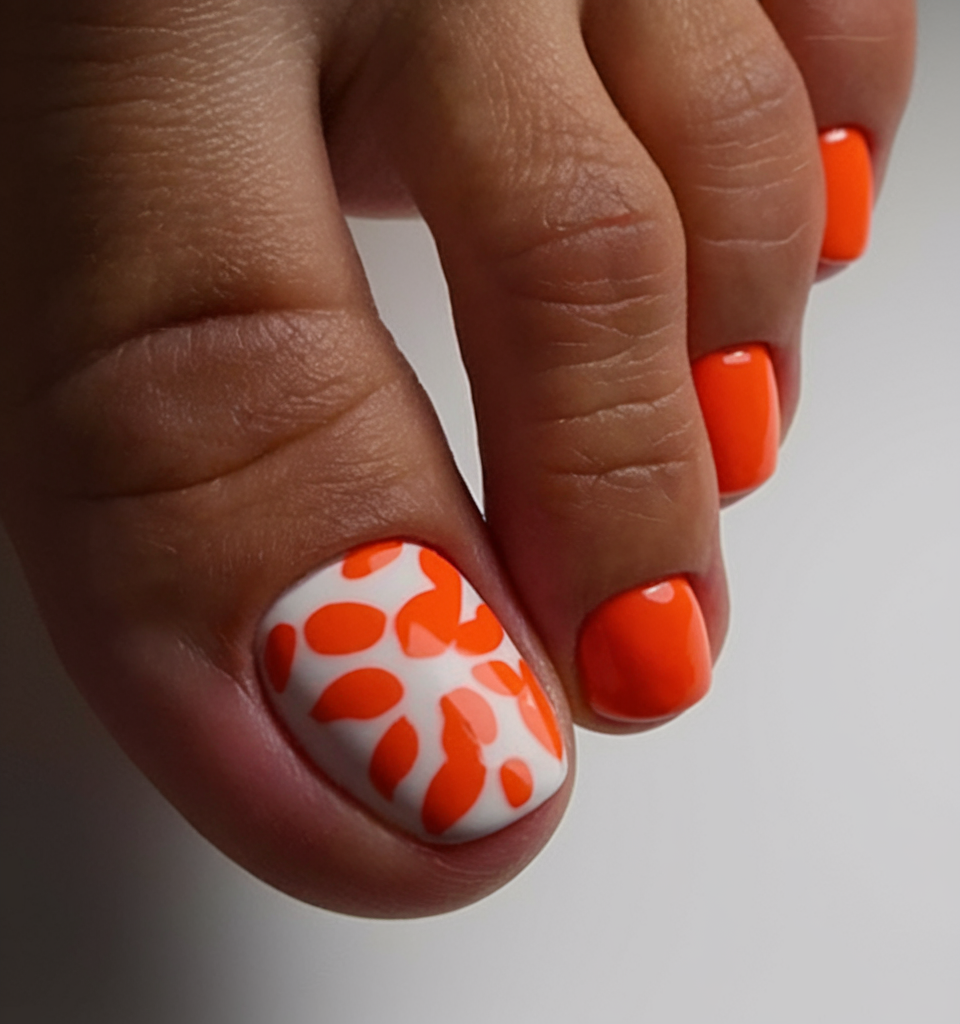 This orange gel polish is a bold and vibrant choice, ideal for summer and spring. The big toe stands out with a white base and abstract orange leopard spots, adding a playful and modern twist. The high-gloss finish enhances the intensity of the colour, making it a fun and eye-catching toe nail design. A trendy choice for those who love bold and artistic nails.