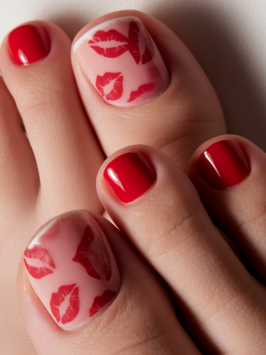 A stunning red and white nail design with lip prints adds a playful and romantic touch to April toe nails ideas 2025. The French-inspired art on the big toe creates a bold statement, while the glossy gel polish makes the red shade pop. This stylish paint technique is perfect for those who love creative accents in their pedicure. The contrast between the pink base and red details gives a chic, polished finish.