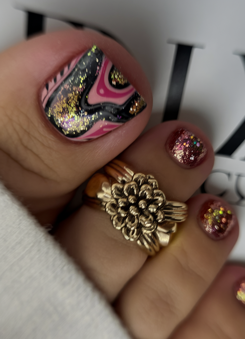 This striking toe nail art combines black, pink, and white polish with a dynamic marble swirl effect. The addition of gold glitter enhances the bold contrast, creating a glamorous finish. The short acrylic nails give the design a neat, structured look while maintaining a playful edge. Ideal for festive occasions or those looking for a dramatic 2025 nail design.
