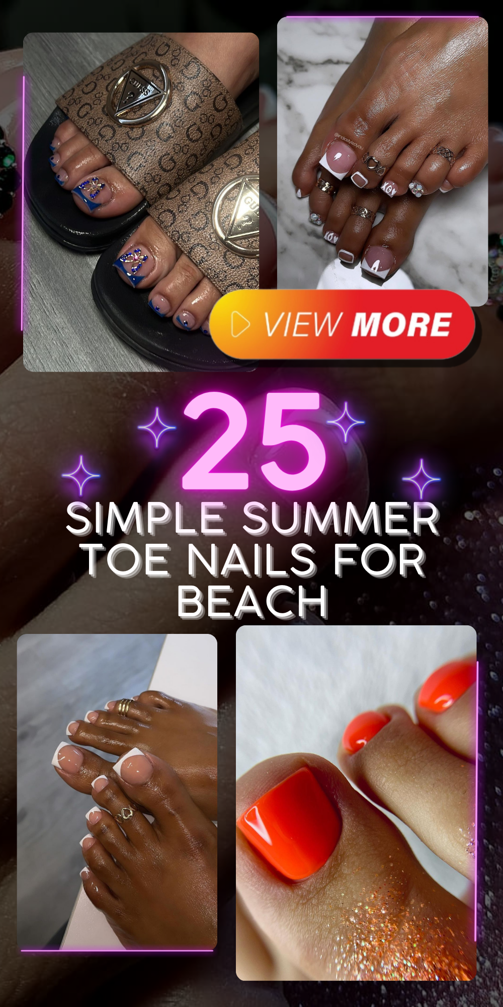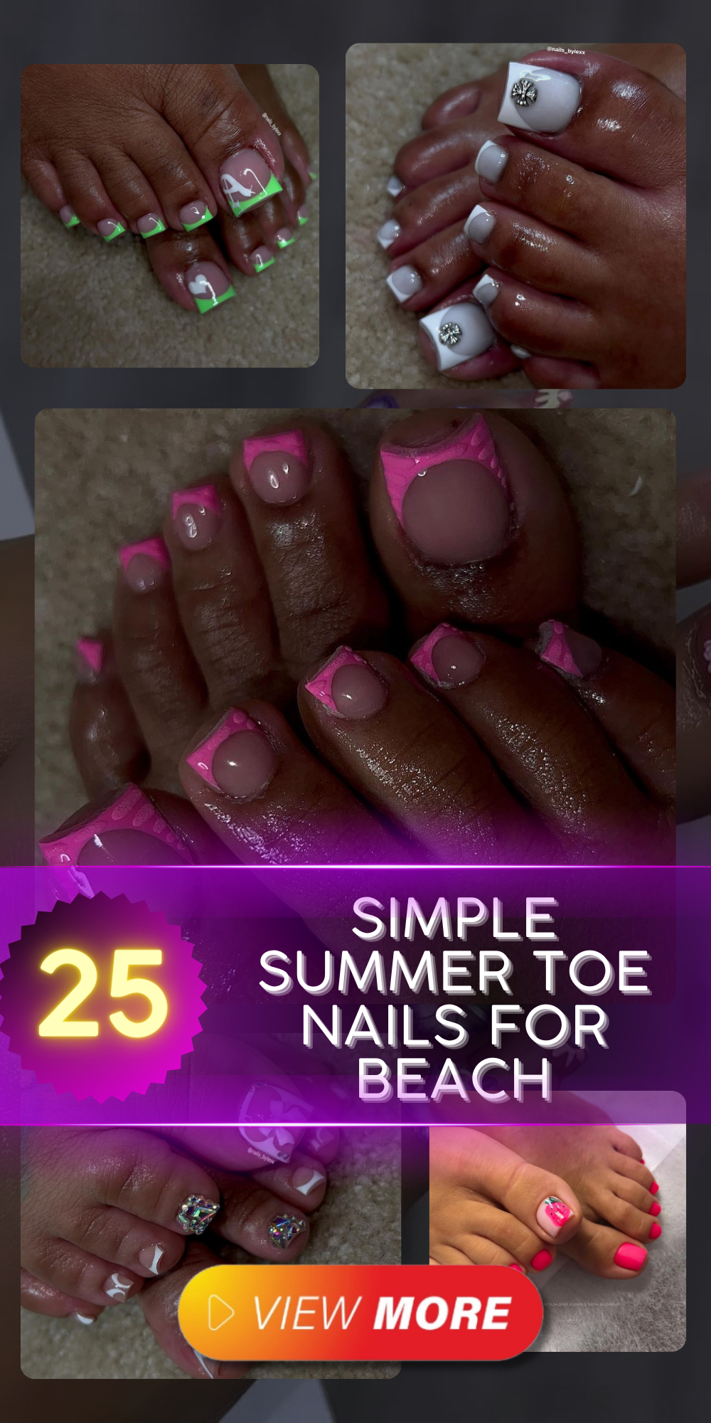 The toes in this image are a testament to how a pop of pink can transform a simple look into a fashion statement. The glossy pink hue adorned with delicate white accents and the matte finish on the big toe is a striking contrast that’s both cute and chic. It’s a style that says vacation simple, yet it’s fashionably put together.