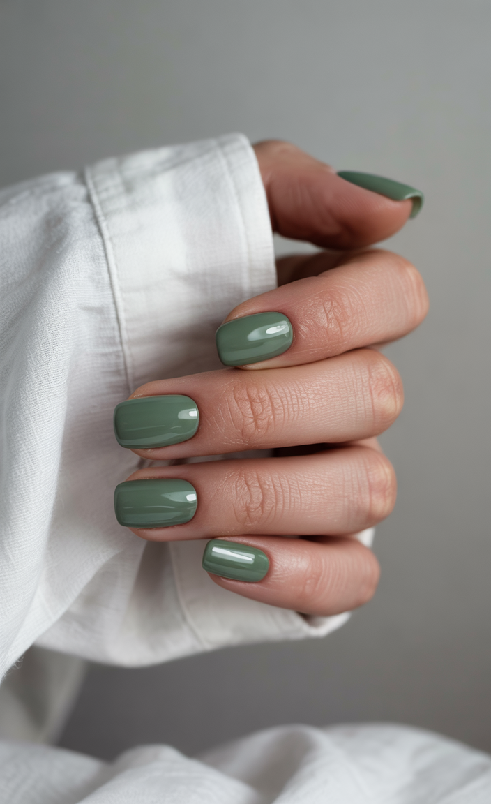 The nails have a sage green color and are finished with a shiny smooth top coat. The nail shape features neat 2025 square short dimensions that are perfect for individuals who want a formal look without extensive maintenance. Anyone interested in making an impact through simple 2025 styles will find perfect aesthetics in this choice. This green shade implements a gentle nod to 2025’s spring-friendly colors.