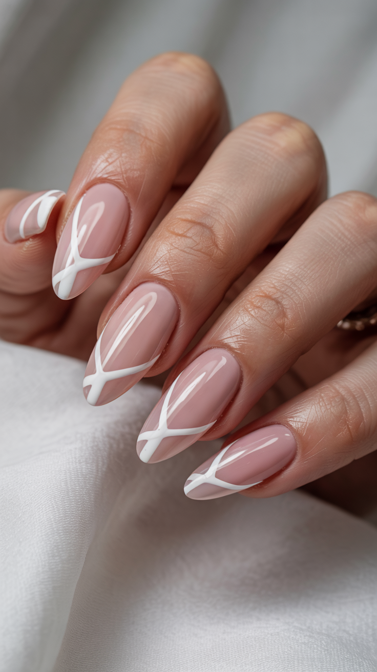 A glossy nude foundation supports the crisscross white lines that form the base of this style. The almond shape of the nails in 2025 provides an elegant and sophisticated finish to the linear pattern. This stylized look fits perfectly with the simple style standards of 2025, yet it provides a contemporary sense of sophistication. Individuals who prefer minimalist art that draws attention with understated hues will love this design.