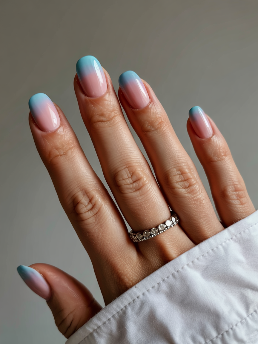 This delicate nail style features a soft transition between soft pink and clear blue hues. Uniform color transitions throughout the design create both depth and elegance, placing it high on the list of select colors for Spring 2025. People can wear this nail design every day because its soft square shape provides a clean, fresh look that fits everyday styles. The May 2025 nail design features this idea as one of its most flexible choices for people who like soft, spring-inspired nail styles.
