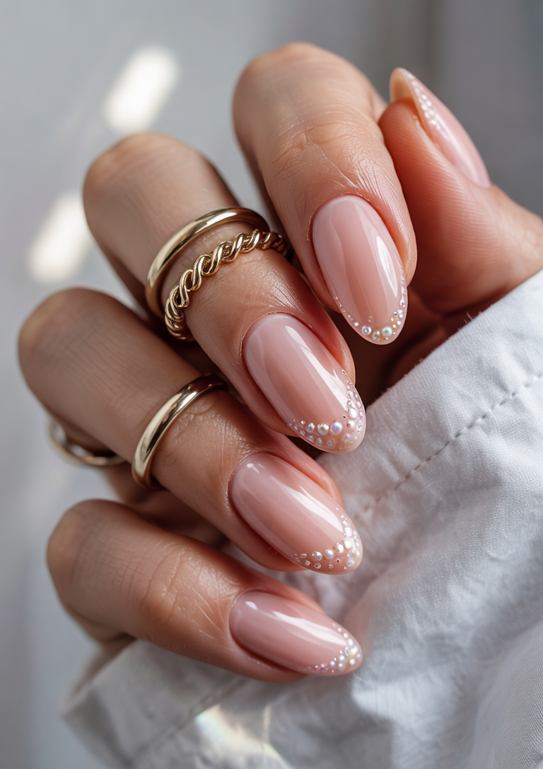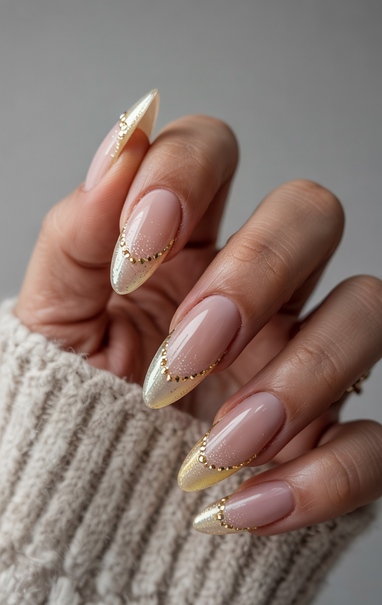 This manicure has gold glitter tips that fade into a neutral nude base with gold beads drawn around the edges. The elongated almond design gives this manicure a sophisticated 2025 style twist on traditional shapes. The gold elements create a warm and sophisticated look while providing a gold or chrome aspect without the need for full 2025 metallic effects. Combining clean appeal with wearable brilliance creates an ideal manicure for spring.