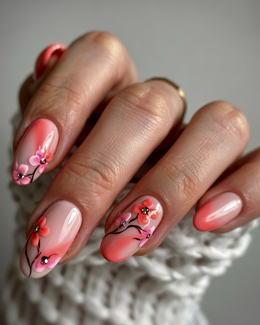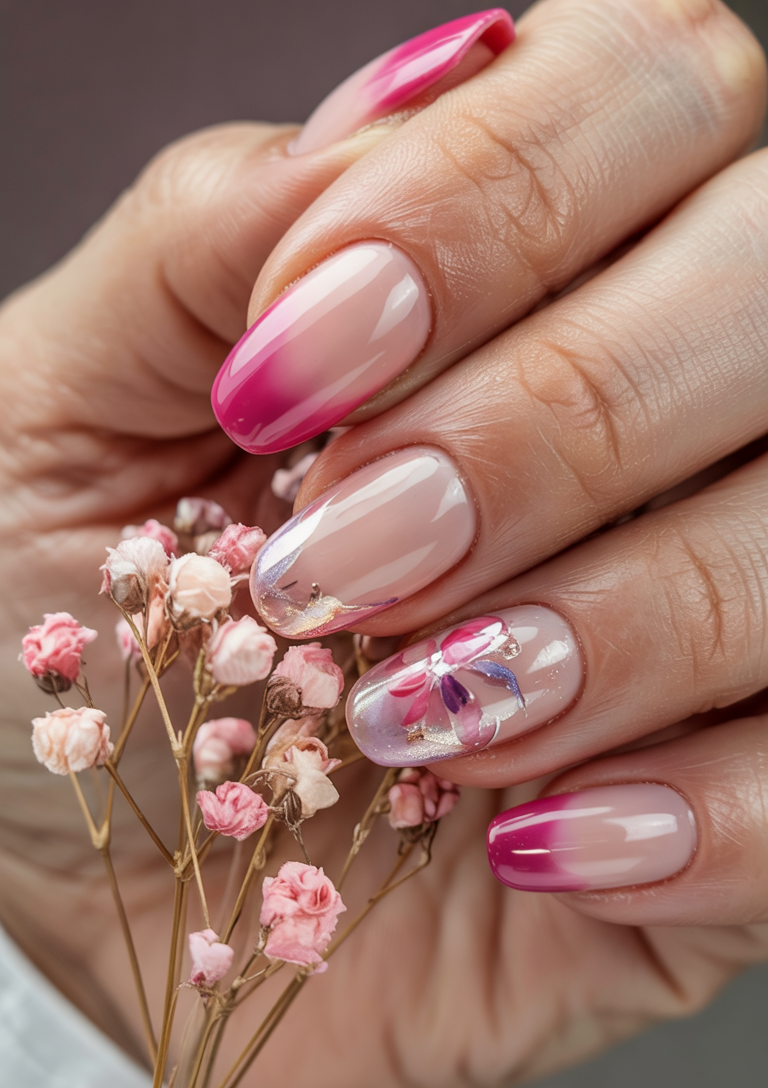 Soft pink ombré tips intersect with floral artwork adorning selected nails over a glossy nude surface. This design utilizes purple and pink petal strokes that are completed with a layer of fine shimmering highlights. This short almond nail shape with its minimalist design represents one of the most captivating almond pink styles of 2025. A perfect blend of April’s softness and 2025’s simple floral artistry.