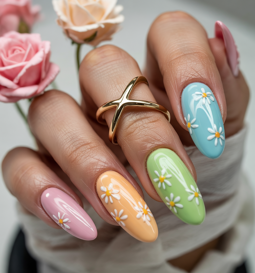 A series of nails are painted in pastel blue, pink, peach and green, while each nail is evenly accented with small white daisies. The full color look along with the floral details reveal the fun essence of the 2025 colors and spring nail trends. This 2025 long almond shape design in soft almond tones offers a contemporary look at this joyful, vibrant nail design. This innovative design shows how to use the 2025 floral concepts in a lively and unique way.