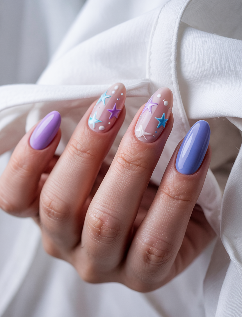 This design features full coverage lavender nails, while the remaining fingers feature pastel 3D stars on a nude base. The 2025 colors of white, purple and teal form star shapes that receive small dot embellishments to create a whimsical, dreamlike finish. This 2025 manicure blends simple, elegant lines with a unique, distinct personality through its rounded profile. Anyone looking for a fantasy touch to their May 2025 nails will appreciate this innovative design.