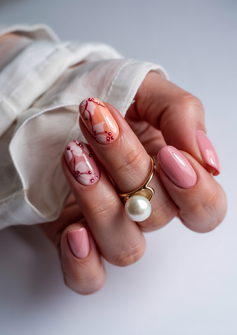 Pink pinstripe nails feature delicate white floral details and minimal berry dots against a soft pink base. The design showcases a spring aesthetic with simple floral artwork that interacts perfectly with delicate pastel tones. The almond-shaped nail design with rounded edges is an elegant understatement, making it a natural choice from the May 2025 Nail Ideas for people who want elegant simplicity.
