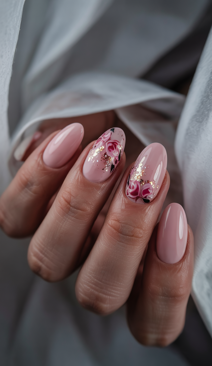 This nail design features 2025 almond nails painted in creamy 2025 almond with a pastel pink hue, while adding the beauty of painted roses alongside gold glitter elements. Floral art elements combined with touching gold flakes create a sophisticated design with deep depth, perfect for elegant spring events. These nails harmonize intricate embellishments with 2025’s minimalist elegance to create fashionable wardrobes that boast simple yet glamorous beauty.