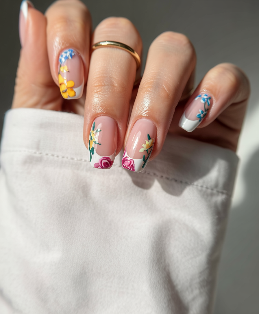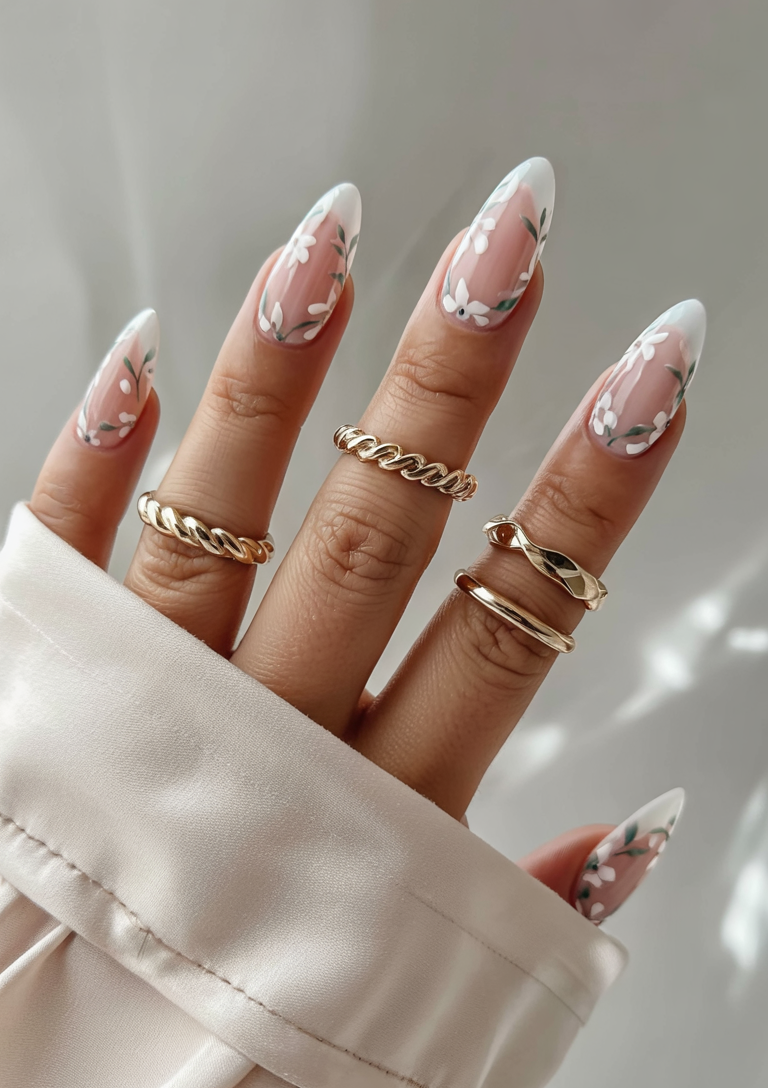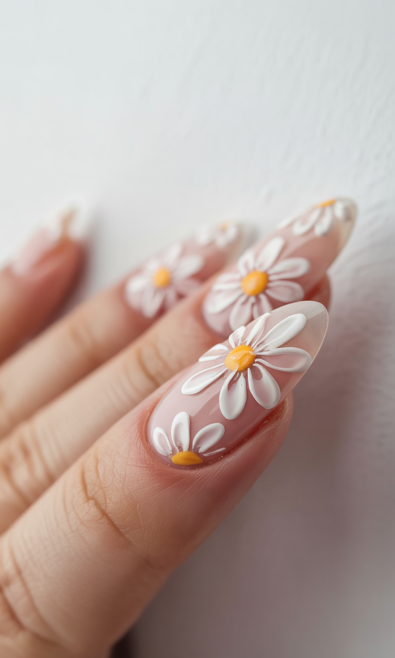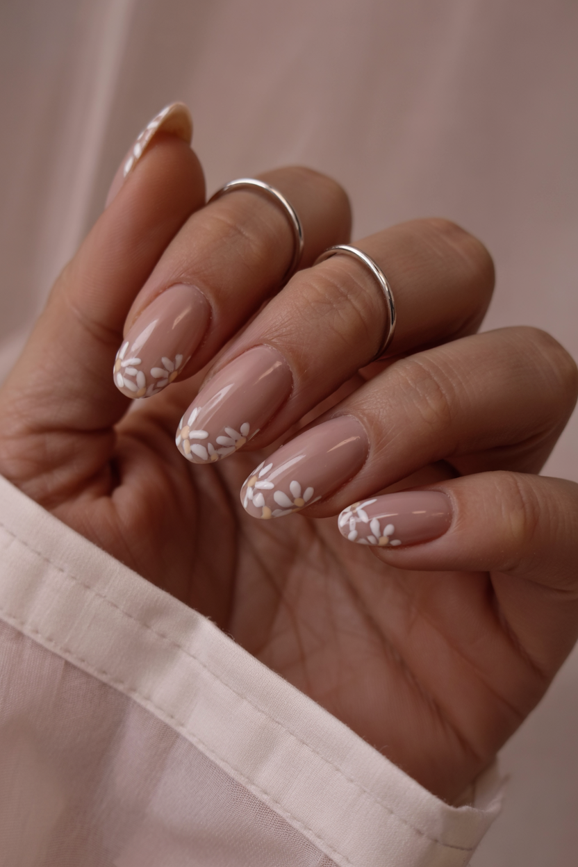 White daisies bloom along the tips of glossy nude nails, accentuating the delicate almond shape. The design captures the essence of spring through its minimalist yet joyful appearance. Standard floral designs that complement natural nude nails are a wonderful addition to the 2025 floral trends, as they provide refined yet casual looks according to the 2025 May Nail Ideas.