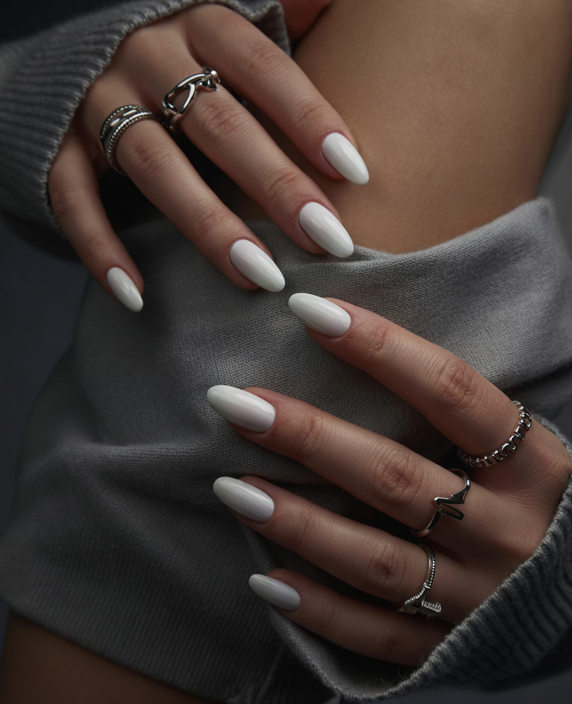 The nail look features a star-shaped soft neutral element that emerges from a clean milky white color. The short almond shape offers the right length for practicality. A manicure that reflects the 2025 almond white fashion trends shows a straightforward design that creates an everyday beautiful appearance. The manicure has a serene glow that is perfect for an April or spring style.