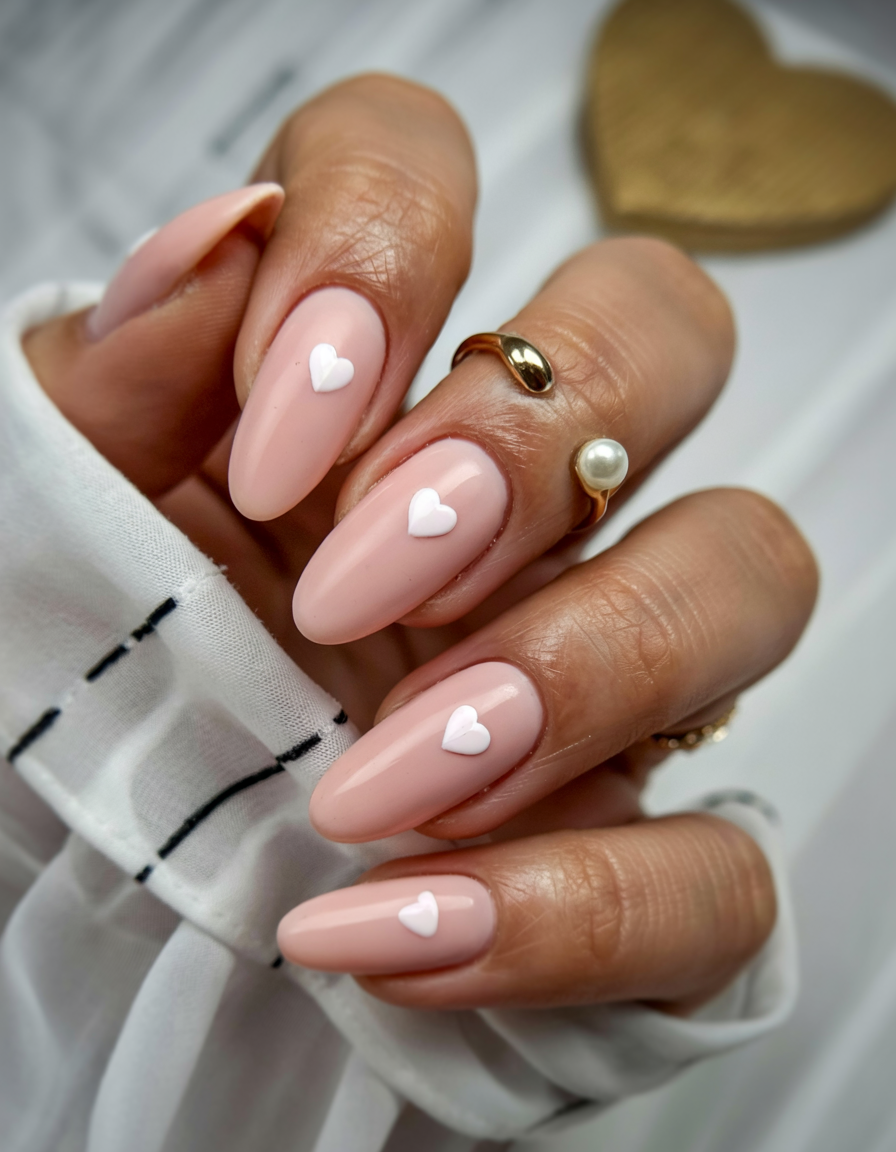 The nail design presents soft nude pink tones as a base, while small decorative white hearts adorn individual nails for minimalist elegance. The 2025 almond shape complements the nails with its feminine and elegant shape. This contemporary interpretation of the simple 2025 nail fashion remains appropriate for basic routines and romantic events during certain seasons. It is a delightful option from the May nails ideas 2025 assortment dedicated to minimalists who want playful touches.