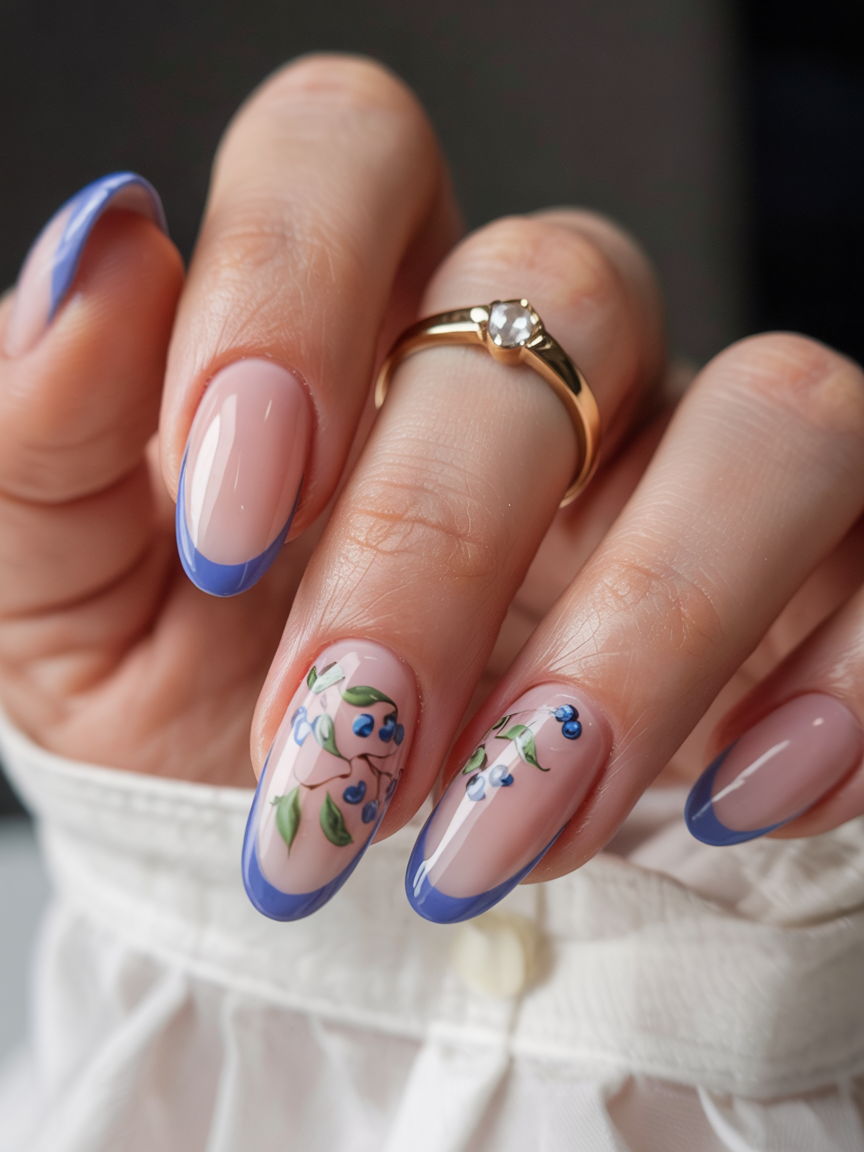 The French Tip gets a contemporary makeover by applying periwinkle blue to the tips, followed by hand-drawn botanical elements featuring berries with green leaves. The polished look of these nails is the result of creative brushwork techniques that exist between the clear base and fluid lines. This design combines artistic delicacy with precise structure through the soft 2025 almond shape. This design stands out from other 2025 nail options because it successfully blends floral and fruit shapes.