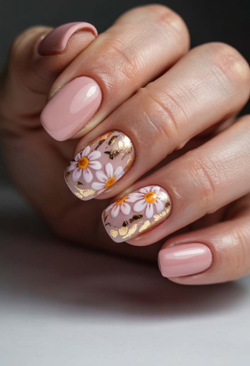Two manicured nails feature daisy characters and gold foil that complements the flush pink glossy finish. The combination of painted flowers and metallic finish elevates this design to an exceptional status for the upcoming 2025 floral trends. The 2025 square design retains the sleek 2025 square shape that combines soft coloring with glossy effects. The 2025 short nail trend brings this spring design as its fashionable floral interpretation.