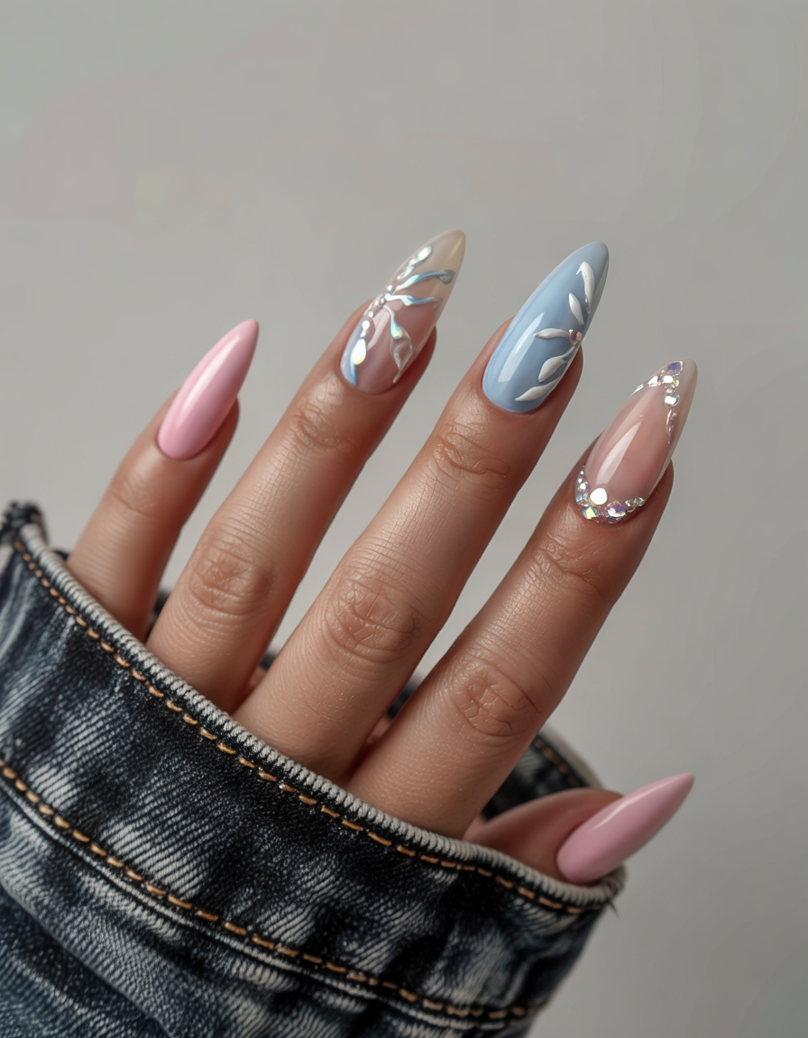 A three-color assortment of pink, nude and powder blue bases is given a luxurious treatment with white 3D floral elements and shiny rhinestone embellishments. The nail application includes a perfect 2025 almond shape for an elegant presentation of artistic elements. The sparkling qualities of the crystals are a perfect match for both the 2025 chrome styles and the May Nails predictions for 2025. The design combines delicate color combinations with intricate patterns to create an elegant look for the spring season.