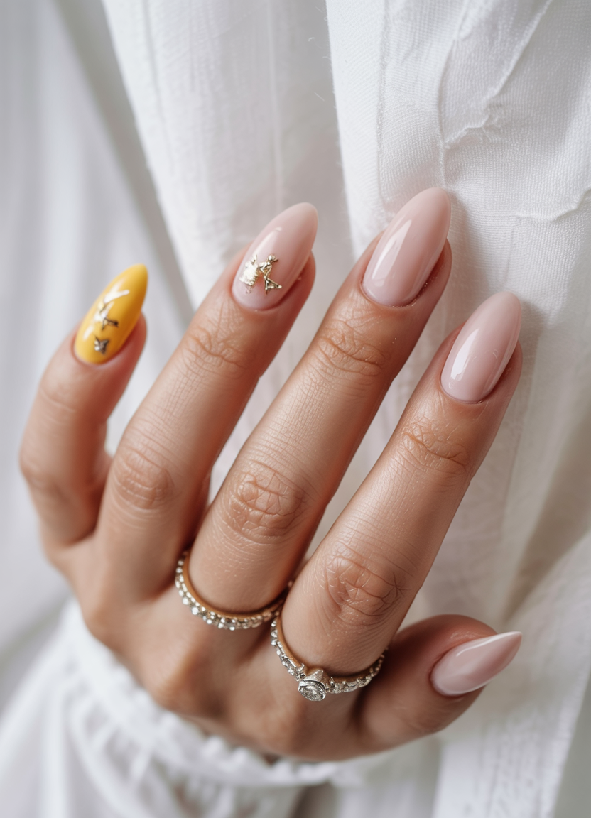 This manicure features a nude base with glossy lacquer, but adds a bold 2025 yellow accent on one nail while incorporating delicate gold foil details throughout. The sleek, modern style creates a sophisticated look that rests on a short, almond-shaped nail design. This manicure offers 2025 fashion minimalism with understated elegance for spring 2022. Minimalism successfully combines seasonal colors into a sophisticated look in this design.