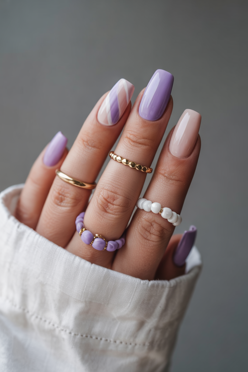 A stylish design combines soft lavender nail polish with a translucent cream base, while diagonal stripes add dynamic movement to the look. A perfect 2025 square construction creates an editorial and contemporary aesthetic. This nail design incorporates trendy 2025 color trends through its creative approach to everyday use. The square pink or purple design stands out as one of the leading 2025 color trends this season.