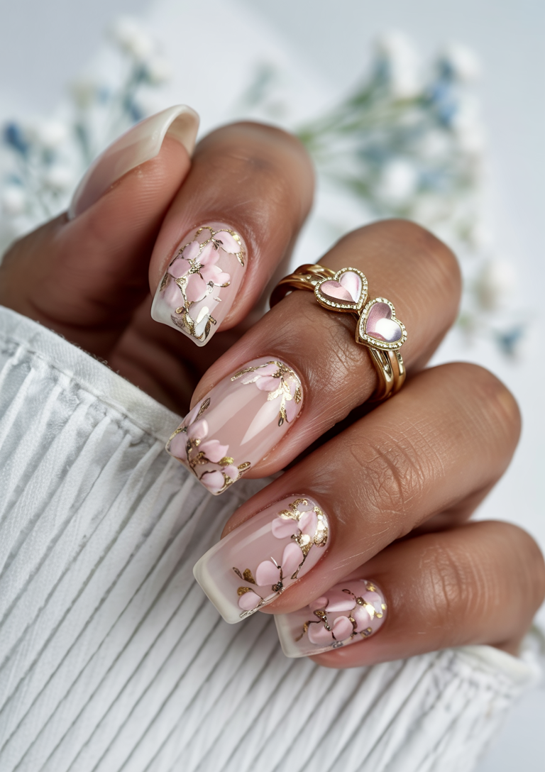 This intricate nail art design features delicate pink flowers framed in gold foil on a translucent pink base. The square 2025 shape provides a clean frame that allows the delicate floral artwork to shine prominently. The mix of 2025 flowers with metallic accents in this design lends both elegant sophistication and romantic charm to all parts. This design is for those who want an elegant artistic flair to their 2025 square short designs.