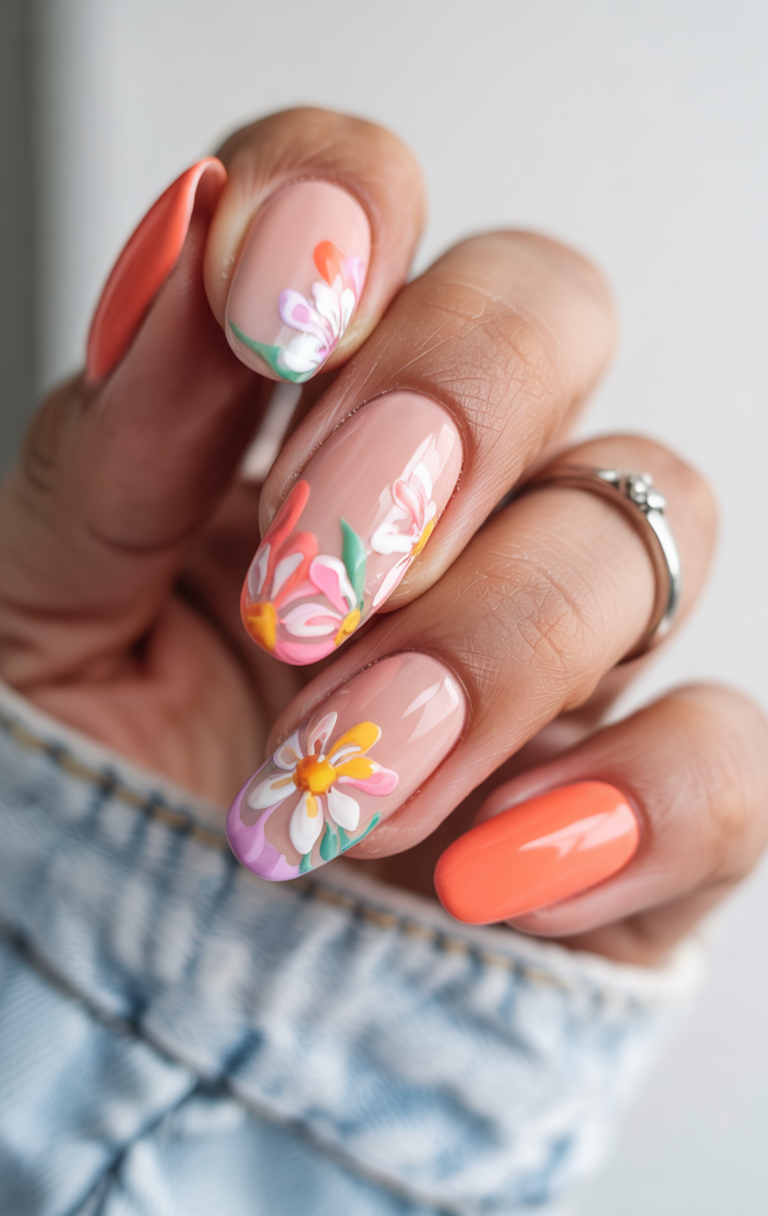 For this trendy manicure, painters have applied delicate flowers in vibrant pinks, oranges and whites to a semi-transparent nude background. The design features 2025 flowers in a soft, natural layout with detailed petal work for a bright yet delicate finish. Using alternating nails with solid orange, this manicure successfully blends the 2025 dip color dynamic with the seasonal floral direction. The almond nail shape brings elegance to the design without losing its light and bubbly nature.
