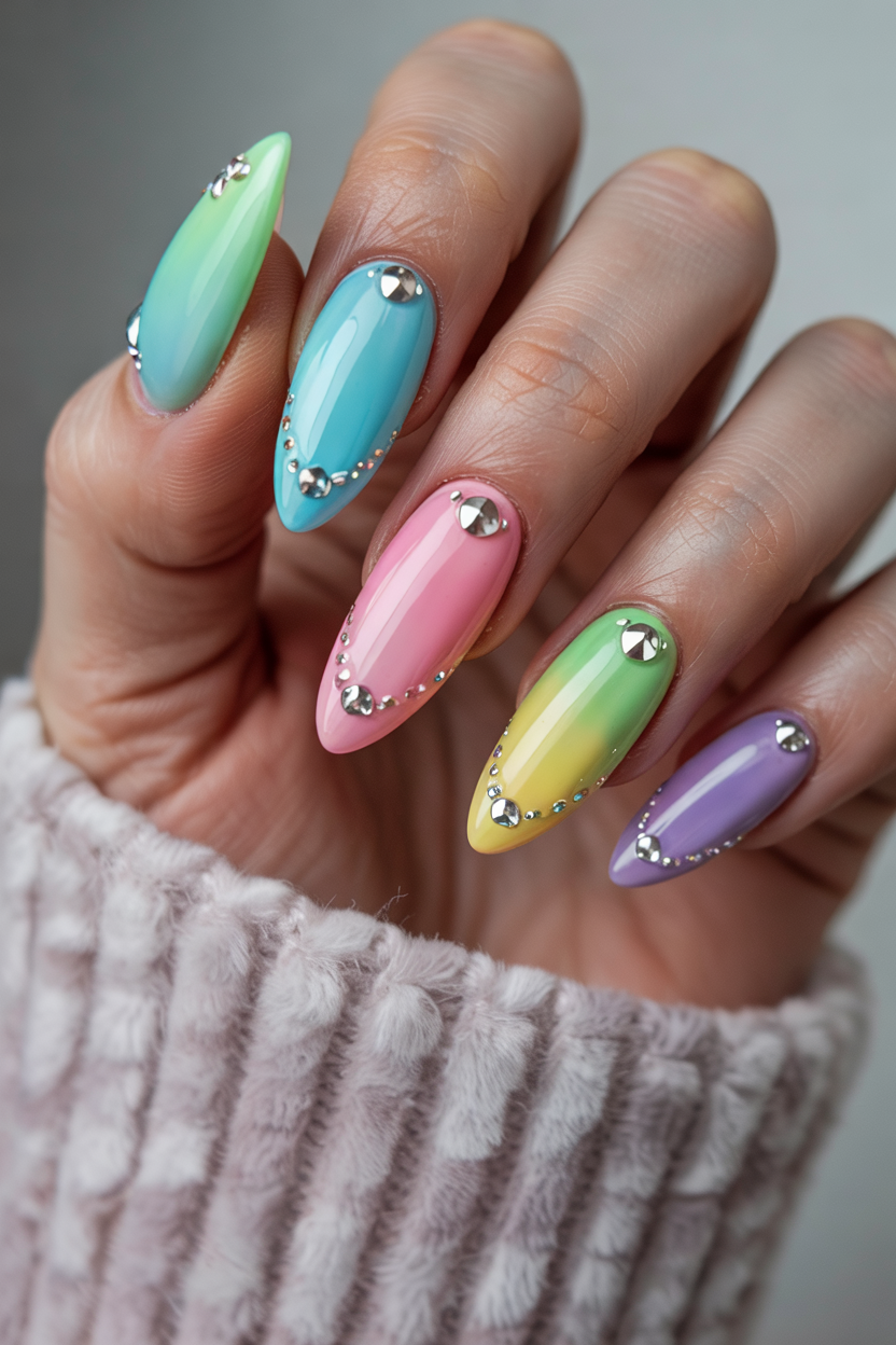The nails follow different 2025 color gradients, each one showing a sequence starting with soft blue, moving to pink, then yellow and ending with green and lavender. Silver studs together with rhinestones frame the nails to create a sparkling effect on the smooth 2025 long almond shape. Those who choose this daring nail style will get a sophisticated interpretation of the 2025 May Nail Ideas that they will love. The design stands alone as it combines modern seasonal tones with expressions of holiday cheer.