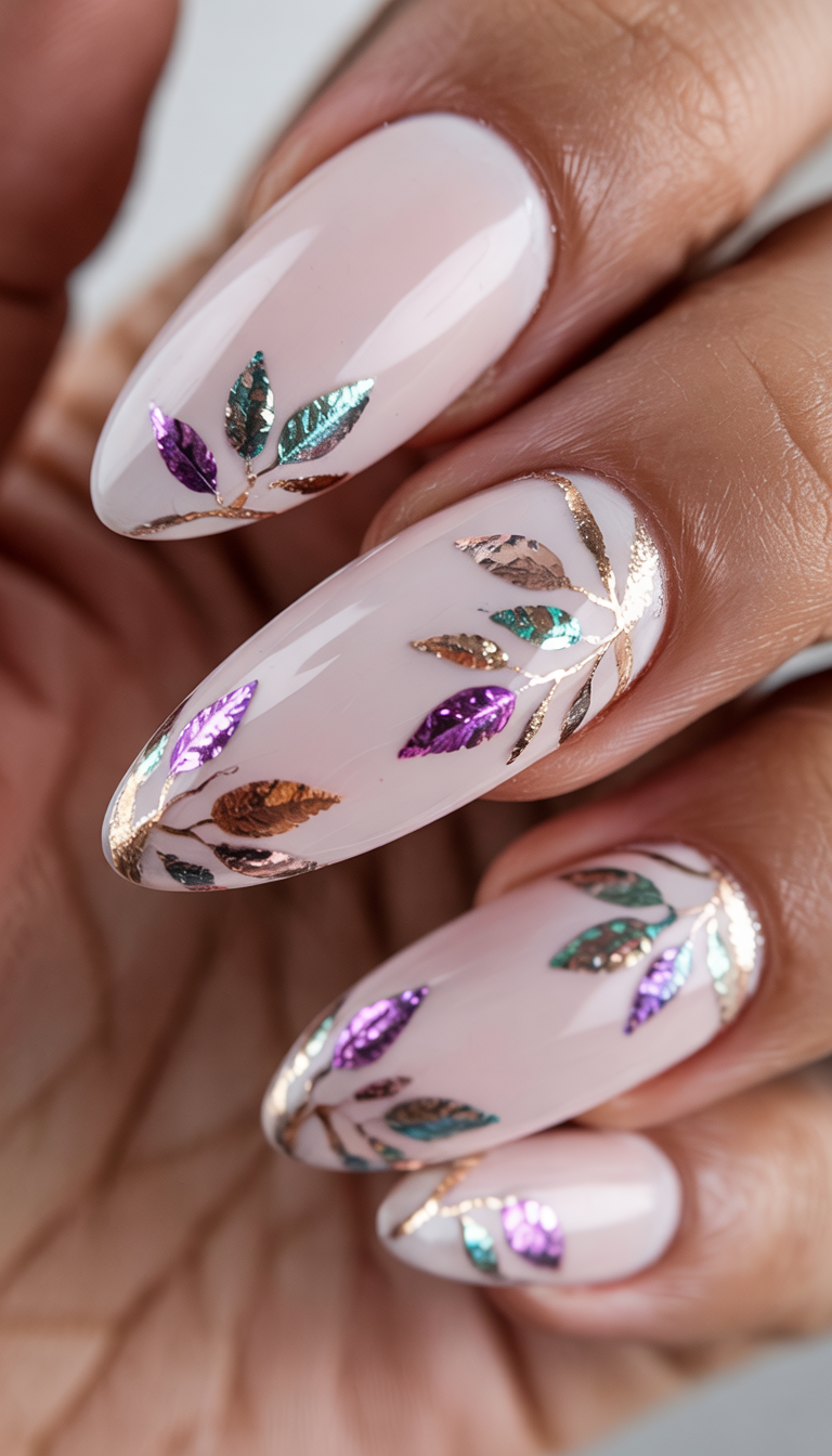 A pale pink, glossy surface contains delicate foil leaves with purple, teal, bronze and gold tones. An almond-shaped design introduces a natural elegance that showcases the complex metallic design elements. This nail style incorporates refined sparkle to create an elegant look that counts as both simple 2025 and artistic May nail concepts for 2025. This spring option works for a variety of occasions as it incorporates sophisticated embellishments that introduce 2025 color themes.