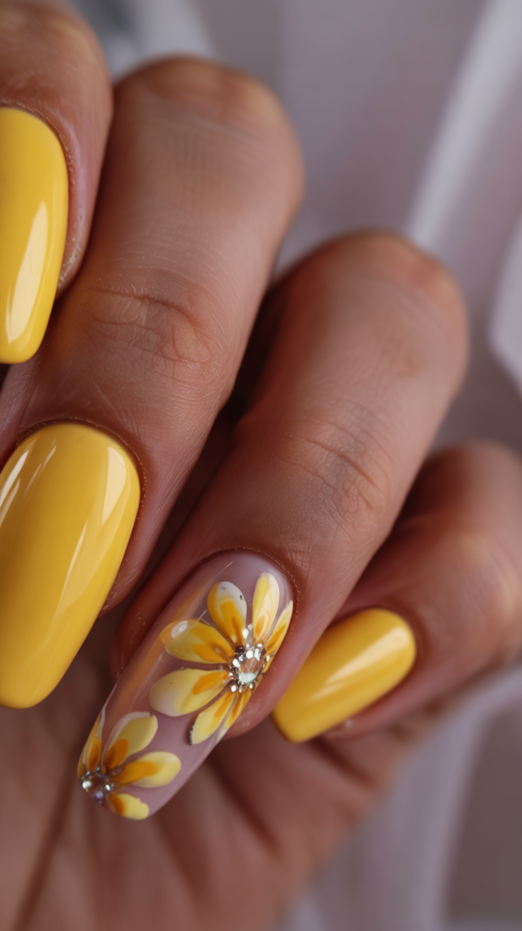 The combination of bright yellow nails gets a clear accent nail that features hand-painted 2025 yellow flowers along with gemstone centers on each nail. The bold, vibrant color along with the texture-enhancing 3D floral painting brings springtime cheer. The nails use either a rounded square shape or 2025 coffin style, creating a harmonious blend of powerful execution with delicate features. This design directly reflects the 2025 floral trend through its sunny appearance.