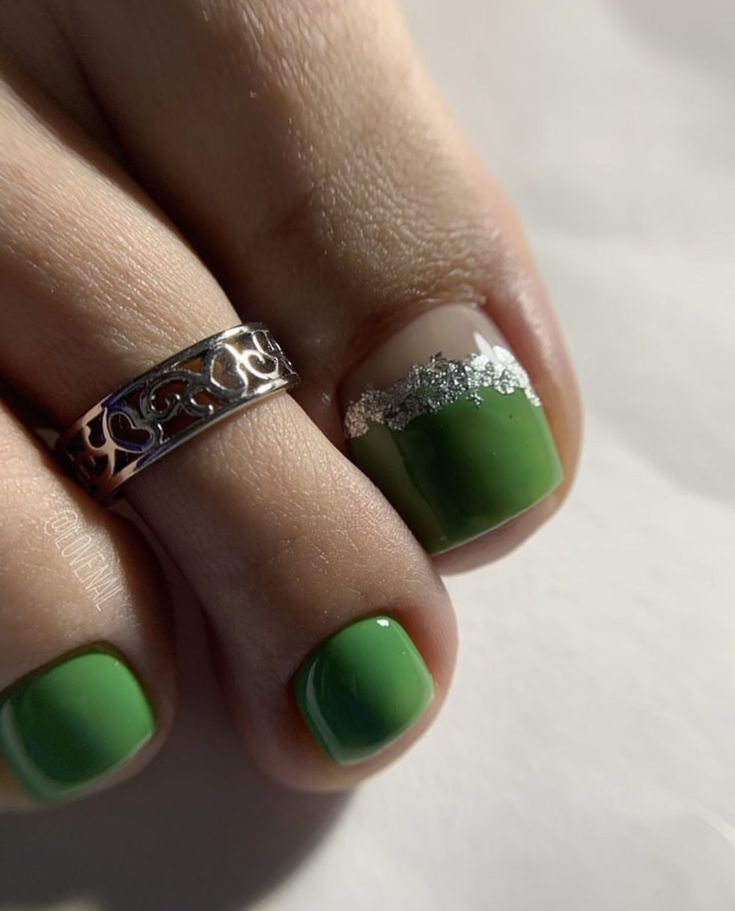 The allure of emerald has long captivated us, and this summer toe nail color 2024 is no exception. Adorned with a shimmering silver gradient at the tips, this pedicure is a nod to the opulent jewels that grace the display windows of the most exclusive boutiques. It’s a classy choice for dark skin tones, providing a beautiful contrast that is both eye-catching and elegant. Whether paired with gladiator sandals or peep-toe heels, these toenails are sure to be the centerpiece of your vacation ensemble.