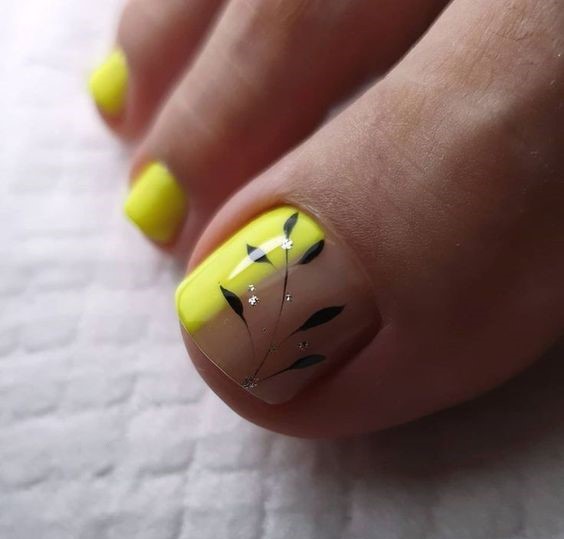 This summer toe nail color 2024 is a zesty take on summer fun. Bright, neon yellow sets a lively backdrop for delicate black and white floral art, making a statement that’s both bold and elegant. A wonderful choice for light skin, it’s like wearing a slice of sunshine on your toes, perfect for brightening up any beach or vacation outfit.