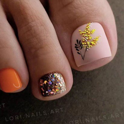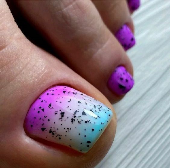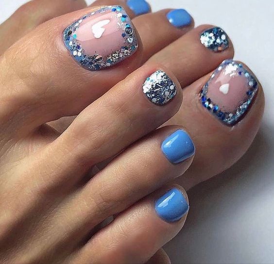 Dive into the depth of the ocean with this stunning pedicure. The soft pastel pink base adorned with an overlay of blue sequins evokes the shimmering sea touched by sunlight. This summer toe nail color 2024 design, with its dreamy gradient and glitter, speaks to those who carry the spirit of the sea in their souls. It’s an ideal choice for vacation vibes that echo the beauty of the coast.