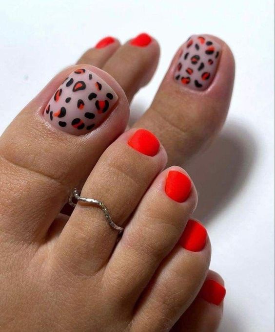 Venture into the wild side of summer with a pedicure that roars in style. The matte finish of the warm, sunset orange paired with a fierce leopard print on a nude background is a bold statement. It’s a perfect matching set for tan skin beauties ready to embrace their inner lioness. This look will elevate a simple pair of sandals to a fashion statement, ideal for any beach adventure or urban safari.