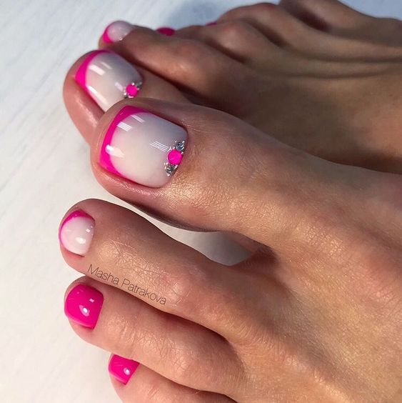 The French manicure gets a vibrant summer makeover in this playful and bright interpretation. Fusing classic sophistication with a pop of hot pink, this pedicure is a chic choice for both light skin and pale skin. The added sparkle at the base is like jewelry for your toes, making this design pedicure bright both classy and fun. Perfect for a Pedi that needs to transition from day to night seamlessly.