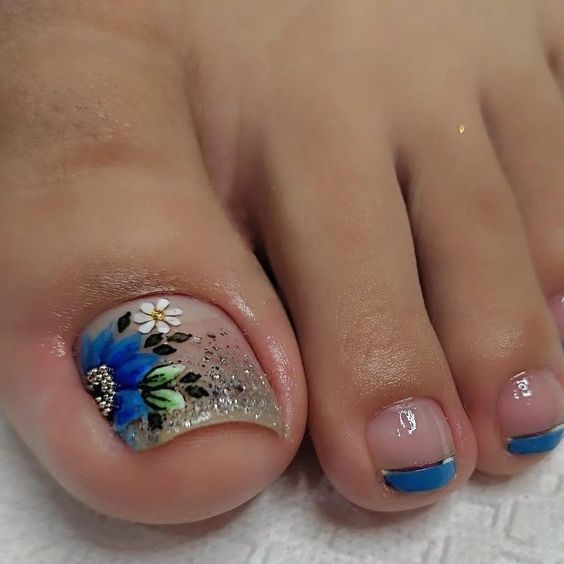 A delicate and refined choice for those who appreciate the subtler things in life, this pedicure is a canvas of pale lilac. The finely painted blue flowers and the soft white accents offer a serene and classy look, ideal for pale skin or light skin tones. This trend speaks of quiet afternoons in sunlit gardens and is the epitome of elegance for any summer gathering or a peaceful retreat.