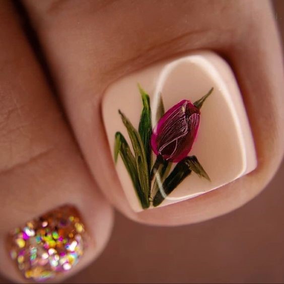 For the romantic at heart, this pedicure showcases a single, detailed tulip against a soft, neutral background, evoking the delicate nature of a single bloom in spring. It’s a subtle yet bright choice for pale skin, offering a sophisticated and classy touch to any summer ensemble.