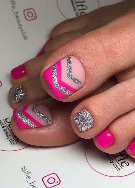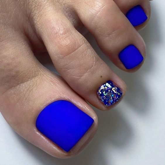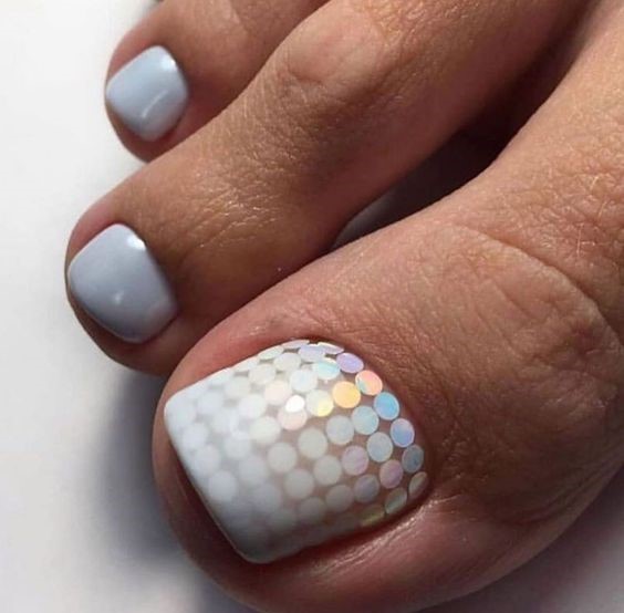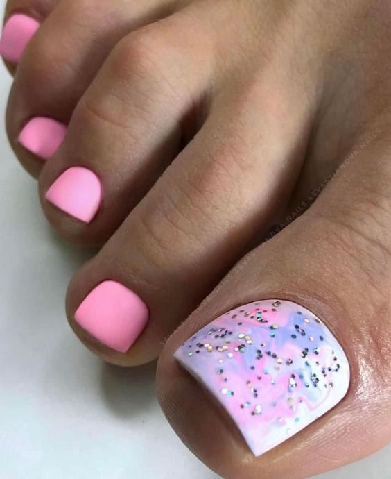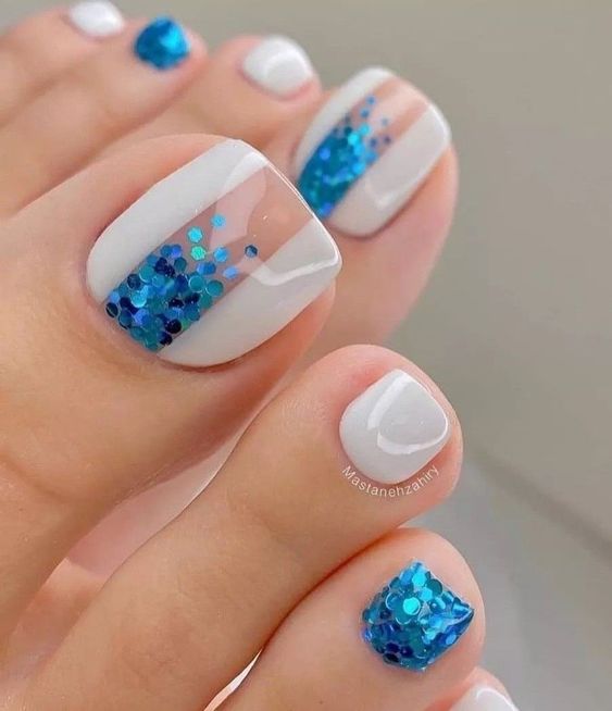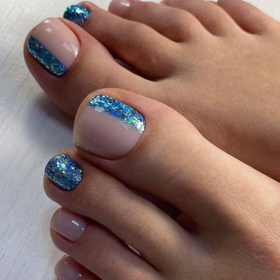 Dive into the depth of the ocean with this stunning pedicure. The soft pastel pink base adorned with an overlay of blue sequins evokes the shimmering sea touched by sunlight. This summer toe nail color 2024 design, with its dreamy gradient and glitter, speaks to those who carry the spirit of the sea in their souls. It’s an ideal choice for vacation vibes that echo the beauty of the coast.